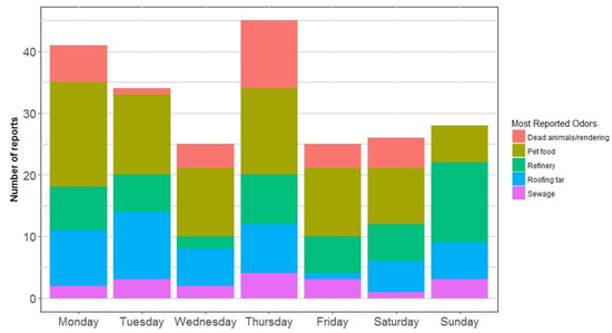 Figure 2 shows day-of-the-week odor reporting for the most-reported-odors in North Denver. The graph shows that the most-reported-odors happened every day except for dead animal odors. The absence of dead animal odor during Sundays is in partial agreement with the percentage of weekly work hours of emission units at Darling International Inc., which is the possible source for dead animal odor as shown in Table 3. Darling International Inc. has nine emission units that work about 33% of the time every week.
