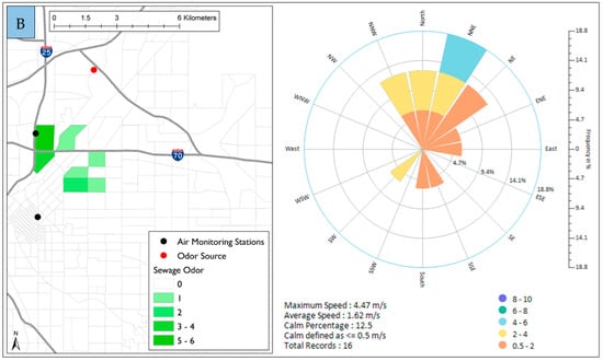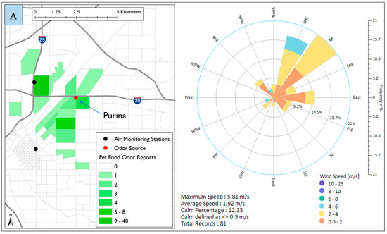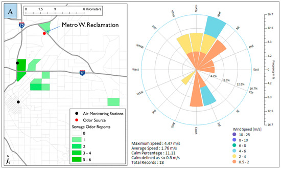 Spatial distribution of sewage odor reports in North Denver and wind roses during the time of reporting. (A) all odor reports; (B) reports from Globeville area and northeast downtown