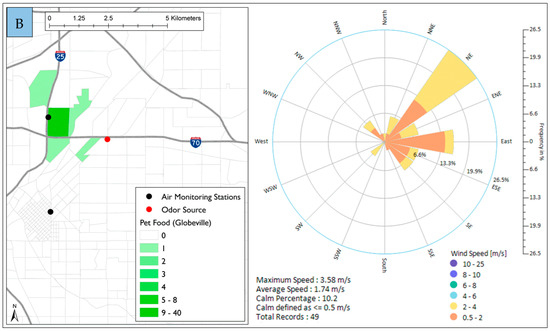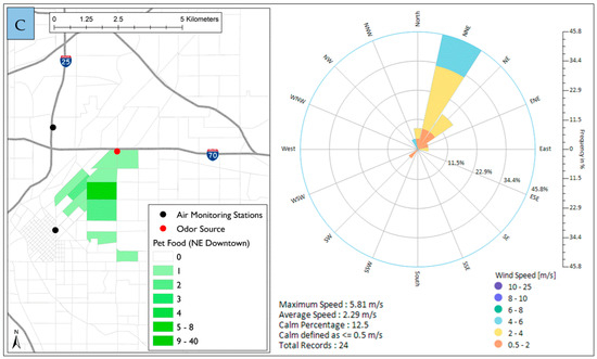 Spatial distribution of pet food odor reports in North Denver and wind roses during the time of reporting. (A) all odor reports; (B) reports from Globeville area; (C) reports from Northeast downtown.