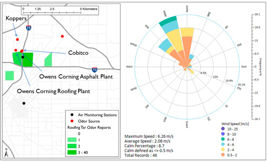 Roofing tar odor was often reported in North Denver. A total of 46 reports were received during the study time. There are four possible sources of roofing tar odor in North Denver: Owens Corning Denver Roofing Plant, Owens Corning Trumbull Asphalt Plant, Koppers Industries Inc., and Cobitco Inc. [15]. Figure 4 shows the location of the four facilities as well as the roofing tar odor reporting locations. During the time of all the 46 reports, 80% of the wind direction frequency was coming from WNW–NNE direction consistent with the location of the four facilities.