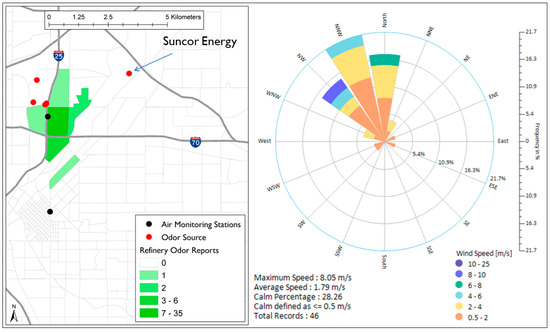 Another frequently reported odor was the refinery odor. The possible source of this odor is Suncor Energy, a major refinery to the east of Elyria-Swansea. When wind direction frequency during the refinery odor reports was calculated, 37% of the wind direction frequency blew from the northeast quadrant (NE), which is the direction of Suncor Energy. However, 81% of the wind direction frequency was coming from WNW–NNE direction suggesting that the refinery odor that was reported in North Denver might not be associated with Suncor Energy only. As we can see in Figure 5, 46 (98% of total) refinery odor reports were documented in Globeville and North Denver downtown. During the time of these reports, the wind direction was mostly from the northwest direction (81% of the wind frequency was coming from WNW–NNE direction). This indicates that one or more of the four facilities located in northeast area is a possible source of the refinery odor.