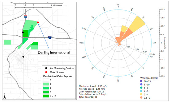 Spatial distribution of dead animal odor reports in North Denver and wind roses during the time of reporting.