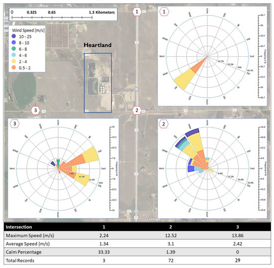 A very limited number of reports were associated with residents’ physical addresses. To protect the privacy of the residents, the reports from physical addresses were assigned to the closest intersection from the three intersections 1, 2, or 3. Figure 8 also shows the location of Heartland Biogas and the wind roses at each intersection during the reported odors. Only three reports occurred at intersection 1. The wind direction frequency shows that the wind blew from the southwest direction during these three reports. At the intersection 2, wind direction frequency was mainly from northwest during the time of 72 reports that were documented at this location. At intersection 3, there were 30 reports during which wind blew mostly from east-northeast. These results show that Heartland Biogas is the most probable source responsible for the odor that was often described as a putrid, chemical or sewage odor. It is important to mention that a total of 28 reports of putrid, chemical and sewage were excluded from the above analyses because they were submitted without clear addresses.