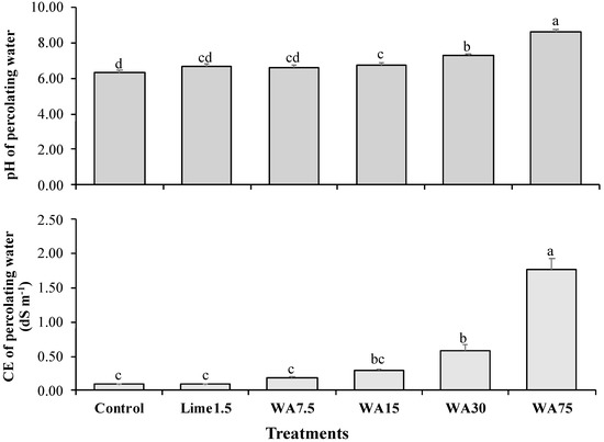 Effect of commercial lime and wood ash on pH and CE of percolating water. Lime1.5, commercial lime at 1.5 g kg−1; WA7.5, WA15, WA30 and WA75, wood ash at 7.5, 15, 30 and 75 g kg−1, respectively. Each bar represents the average of three repetitions, along with its standard error. Different letters (a, b, c, d) for each variable indicate significant differences, according to the Tukey test (p ≤ 0.05).