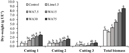 Dry weight of ryegrass (Lolium perenne L.). Cuttings 1, 2, and 3 were taken at days 40, 70, and 100 post-seeding, respectively. The total biomass includes the three cuttings plus the residual mass. Lime1.5, commercial lime at 1.5 g kg−1; WA7.5, WA15, WA30, and WA75, wood ash at 7.5, 15, 30, and 75 g kg−1, respectively. EU, experimental unit. Bars indicate standard error of the mean (n = 3). Means with different letters (a, b, c, d) differ significantly (Tukey’s test, p ≤ 0.05).