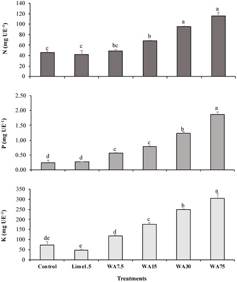 In the aerial shoot part of the plant, N, P, and K contents significantly increased following the application of WA (Figure 3). For N and K, significant differences were registered from the 15 g kg−1 WA, while P increased significantly from 7.5 g kg−1 WA.