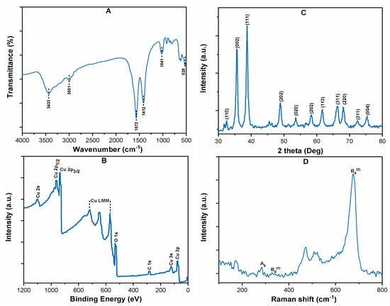 Characterization: (A) FT-IR; (B) XRD; (C) XPS survey spectrum; and (D) Raman survey spectrum of CuO powder.