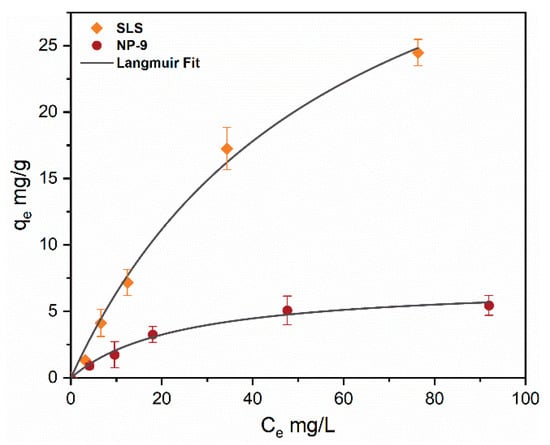 where qe (mg/g) is the sorbed amount of SLS and NP-9 onto the surface of CuO; Ce (mg/L) is the equilibrium concentration of both surfactants in suspension; qm and KL (L/mg) shows the maximum saturated sorption amount and the Langmuir constant relating to binding strength, respectively; and KF and n (L/mg) in the Freundlich equation correspond to the adsorption capacity and intensity of heterogeneity, respectively.
