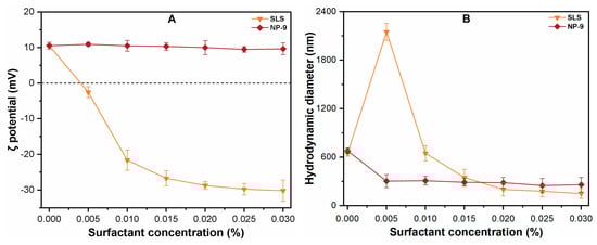 Effects of surfactants concentration (0–0.030%) on the (A) ζ potential; (B) hydrodynamic diameter of CuO NPs suspension at pH (7.0 ± 0.1).