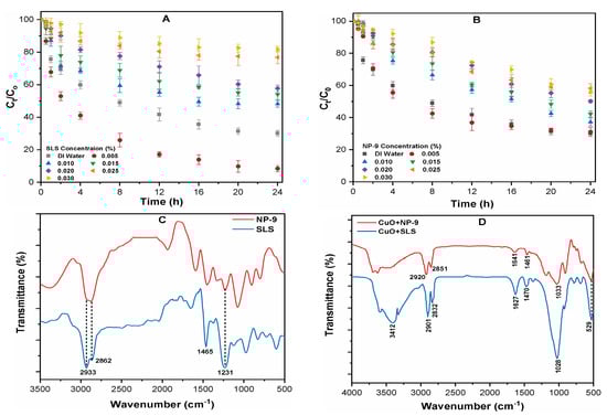 In addition, the FT-IR spectra of pristine surfactant and CuO-surfactant complexes were analyzed in order to explore the functional group attachment on the surface of CuO NPs (Figure 4C,D). The peaks around the 3400–2800 cm−1 regions are ascribed to the asymmetric and symmetric stretching of CH3, CH2, and OH bonds [27]. The bands at 1465 and 1231 cm−1 correspond to the bending of CH2 and C-O stretching along with OH deformation in COOH, respectively [28]. The asymmetric doublet peak for OSO3 stretching in pristine SLS shifted down in frequency at 1028 cm−1, and it appeared in the spectrum of SLS adsorbed CuO complexes [29]. This significant shift in wavenumber indicates that the primary adsorption mechanism may involve hydrophobic and electrostatic interactions [30]. The appearance of certain bands and shift in peaks of the CuO-surfactant complexes confirms that the surfactant made enough of an impact on the metal oxide surface. Moreover, the disappearance and significant shift to 1033 cm−1 in the (CuO+NP-9) spectra further suggests the attachments of the hydrophilic tail and phenol head [20,30]. Therefore, the presence of surfactant may increase the environmental risk of CuO NPs by altering their mobility and fate in the water matrices.