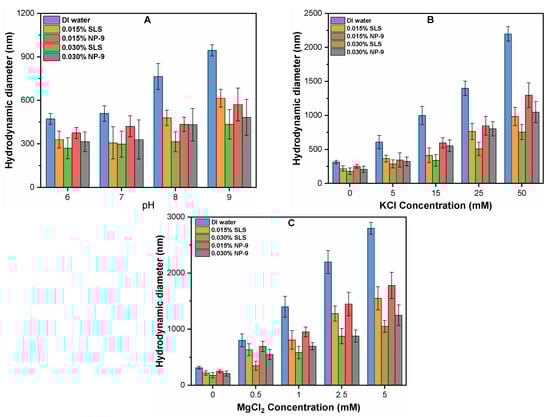 The solution chemistry may affect the properties of the CuO NPs, such as their solubility, particle size, and surface potential. Thus, experiments were conducted at varying pH (6–9) of media containing ranges of (0.015–0.030%) of SLS and NP-9 (Figure 5A). The results indicated that, as the initial pH of the solution increased from 6 to 9, the average particle size of CuO aggregate was enhanced from 550 ± 68.2 to 1040.1 ± 205.4 nm. A significant increase in the HDD of CuO was observed between 8 to 9, which may be attributed to the closeness of the zero point of charge of the solution. The NPs have zero/negligible surface potential, thus significantly weakening the electrostatic repulsive forces between the particles, thereby increasing the size of NPs [12,14]. However, the addition of surfactant significantly retarded the growth of CuO aggregates. For instance, in the absence of both surfactants, the aggregate size of CuO at pH 9 was found to be 1040.1 ± 205.4 nm after 24 h. However, the HDD of CuO NPs in the suspension containing 0.030% SLS and NP-9 were reduced to 51.31 and 38.24%, respectively (Figure 5A). This may be attributable to the electrostatic steric hindrance effect of surfactant molecules, which reduces the size of the CuO NPs in suspension [26]. Moreover, the effect of SLS on the size reduction of CuO was more pronounced than that of NP-9 surfactant.