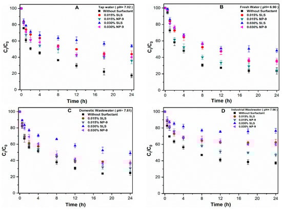 Figure 6 presents the influence of the surfactant type (SLS and NP-9) and concentration (0.015 and 0.030%) on the aggregation behavior of CuO NPs in natural water matrices. The results indicate that the addition of both surfactants hinders the sedimentation of CuO NPs in all studied types of water. Moreover, the discrepant aggregation behavior of CuO NPs in the presence of SLS was observed in all of the natural waters. These results are consistent with those of an isotherm study which showed the strong adsorption potential of SLS molecules on the surface of CuO NPs (Figure 2), resulting in reduced aggregation. Upon the additions of (0.030%) SLS and NP-9 in tap water, around 58.76 and 40.23% of CuO NPs remain stabilized in the solution after 24 h, respectively (Figure 6A). By contrast, the measured values at the same surfactant concentration in DI water were 80.01 and 58.15%, respectively. Our observation is consistent with a previous study [9] which reported that many parameters, i.e., pH, DOM, and IS, may affect the aggregation behavior of CuO NPs in the aqueous solution.