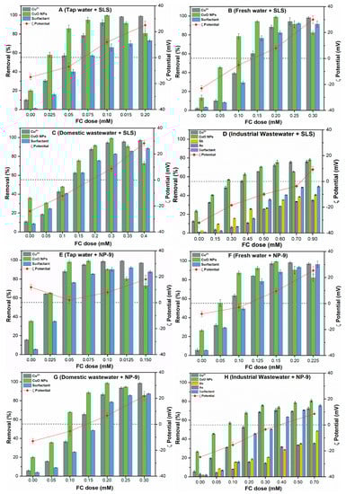 Removal of CuO NPs, Cu2+, surfactant, from environmental waters (A–H), as a function of FC coagulant dosage with corresponding ζ potential.