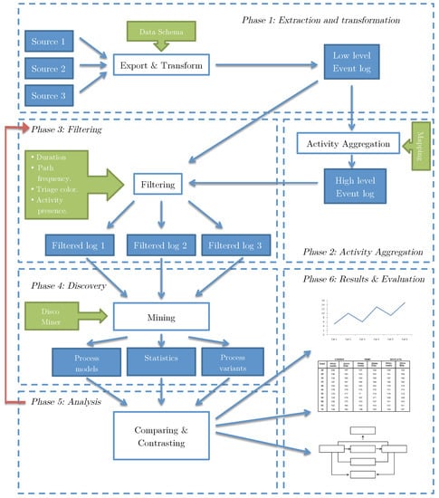 The phases include Extraction (obtaining and processing raw data to create a low level event log), Activity Aggregation (building high level event logs based on the previously generated low level event log), Filtering (applying tools to filter the event log by different attributes), Discovery (discover a process model from the filtered event log and getting information about process variants and statistics from the discovered model), Analysis (comparing, examining and explaining discovered models), and Results and Evaluation.