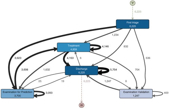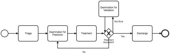 Figure 6 shows a process model with the activities executed during the ETD sub-process. The Treatment sub-process begins with “Examination for Prediction”. This activity includes all nurse and physician activities that occur before any actual treatment is performed. After this examination, a consultation to a specialist could happen. Then, the process continues with the actual treatment. After the treatment is finished, the patient is discharged. Also, a loop between examination for prediction and treatment is identified. Subsequently, after the patient is treated, a physician could request a final examination to validate whether the patient could be discharged or not. It is worth noting that the difference between short and long episodes depends almost exclusively of this sub-process. Long episodes of the complete process are the ones that include several of these “examination for prediction–treatment” repetitions. Finally, patient discharge is straightforward. After aggregating the activities into one general discharge activity, the sub-process was collapsed into only one activity. The process structure is simple and sequential. Each activity is directly followed by the previous one with no alternative paths.