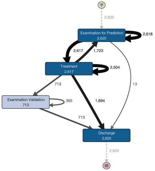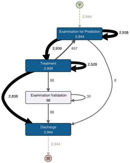 Figure 8. The “Examination Validation” sub-process is more common in the slower episodes, since it is present in 27.2% (713 of 2620 episodes) of them. Therefore, it is important to study and identify why it occurs, evaluate its contribution, or the time it takes to perform it. In addition, a loop between the “Examination for Prediction” and the “Treatment” sub-processes was identified on both process models (