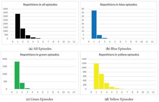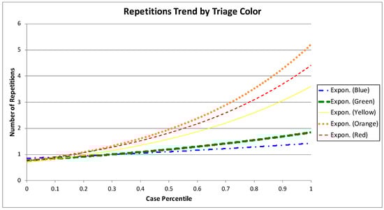 Figure 9d,e make clear that the portion of episodes with two or more repetitions increases as the severity of the episode is higher. The number of repetitions trend by triage color is shown in