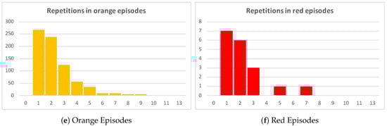 Figure 10. The trends of higher severity episodes are more steep, which enforces previously shown results. For example, the trend for green episodes moves between one and two repetitions, while the trend for orange episodes is between one and six repetitions.