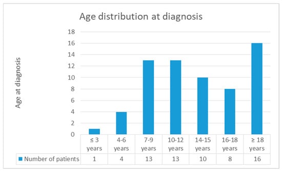 As a matter of fact, the first symptoms occurred before the age of 18 years in 116 cases, but only 67 patients (57.8%) were diagnosed with MRS before this age [2,3,4,5,10,12,13,14,15,16,17,18,19,20,21,22,23,24,25,26,27,28,29,30,31,32,33,34,35,36,37,38,39]. Two of the three cases we have reported have been diagnosed under the age of 10; interestingly, literature describes only 18 cases in which diagnosis was made that early [10,14,15,16,17,18,27,31,34,35,37,39]. As highlighted in Figure 3, MRS in children is mostly diagnosed at between 7 and 12 years of age [5,10,14,16,17,18,19,22,24,27,29,34,35,36,37,39]. The youngest patient, described by Ehmann et al., was 22 months old [14]. The bar chart referring to the “Age distribution at first episode” shows that the onset of the disease covers a wider age interval, between 4 and 15 years (Figure 4) [2,3,5,6,7,12,13,16,17,19,22,23,24,25,26,29,30,31,33,35,36,37,38,39].