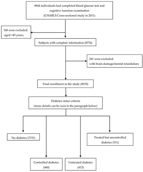 The current study was the secondary analysis of the baseline data collected between 2011 to 2012. From 17,707 individuals, 8944 participants with complete data in blood glucose test and cognitive function examination were selected. To be included in this study, participants (age ≥ 45 years) should have complete data on gender, educational level, blood glucose, fasting status, systolic blood pressure, diastolic blood pressure, body mass index (BMI), depressive symptoms. The exclusion criteria were: having brain damage or mental retardation. Eventually, 8535 participants were included in the current study, and they were classified into four groups based on the criteria for diabetes mellitus and treatments on diabetes, including 7151 non-diabetes, 460 people with controlled diabetes, 413 people with untreated diabetes and 511 people with treated but uncontrolled diabetes. More details regarding study population selection were provided in Figure 1.