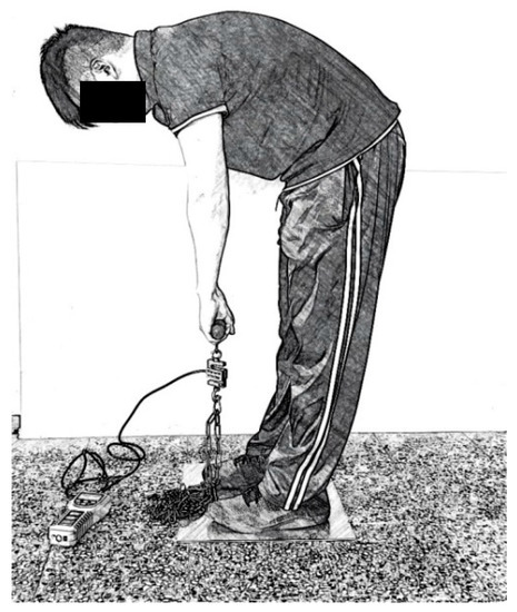 Before the trial, the isometric back, and leg strengths were measured. For these measurements, the participant stood on a platform and pulled a handle connected to the platform upward. A loadcell was hooked between the handle and the platform to measure the force. The participant applied his/her maximum force for 4 to 6 seconds. The peak force was displayed and recorded. For isometric back strength, the participant stood and bent his/her waist to grasp the handle 38 cm above the platform and pulled upward with maximum force (see Figure 1). This force was the maximum voluntary contraction of the back muscles or MVCback. For the isometric leg strength, the participant bent his/her knee with upper body straight to grasp the handle 38 cm above the platform and pulled upward with maximum force. This force was the MVCleg. The procedure performing these strengths measurements followed those in Ayoub and Mital [42]. The participant took a break for at least five minutes after taking a strength measurement so as to avoid the effects of muscular fatigue on the next measurement.