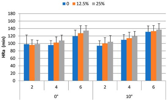 The ANOVA results indicated that HRa were significantly affected by the weight carried (p < 0.001), walking speed (p < 0.0001) and ramp angle (p < 0.001). The Duncan’s multiple range test results indicated that HRa of the 25%BW condition (116.9 bpm) was significantly (p < 0.05) higher than those of the 12.5%BW (112.1 bpm) and 0%BW (107.9 bpm) conditions. The HRa of the 12.5%BW condition and that of the 0%BW were not significantly different. The HRa for the 2 km/h (98.4 bpm) condition was significantly (p < 0.05) lower than those of the 4 km/h (108.1 bpm) and 6 km/h (130.3 bpm) conditions. The HRa for the 4 km/h condition was significantly (p < 0.05) lower than that of the 6 km/h conditions. The HRa of the 0° ramp angle condition (108.7 bpm) was significantly (p < 0.05) lower than that of the 10° condition (115.8 bpm).