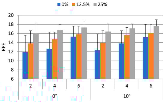 The ANOVA results indicated that the RPE were significantly affected by the weight carried (p < 0.0001) and walking speed (p < 0.0001). The Duncan’s multiple range test results indicated that the RPE without load carrying (13.5) was significantly (p < 0.05) lower than those of the 12.5% (15.0) and 25% (16.8) BW conditions. The RPE for the 12.5% BW condition was significantly (p < 0.05) lower than that of the 25% BW condition. The RPE when walked at 2 km/h (14.0) was significantly (p < 0.05) lower than those of the 4 km/h (15.1) and 6 km/h (16.2) conditions. The RPE for the 4 km/h condition was significantly (p < 0.05) lower than that of the 6 km/h conditions. The effects of ramp angle on RPE were not significant.
