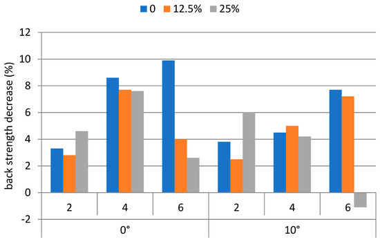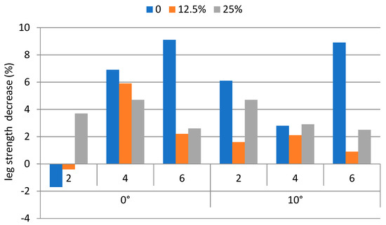 The decreases of the back strengths, averaged over each weight carried, walking speed, and ramp angle condition were between −1.1% and 9.9%. The corresponding leg strength decreases were between −1.7% and 9.1%. The strength decreases (%) on the back and the leg for performing the backpacking tasks are shown in Figure 5 and Figure 6, respectively.