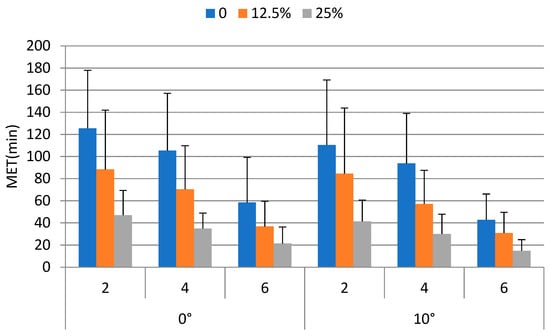 Figure 7 shows the MET under experimental conditions. The MET averaged over each weight carried, walking speed, and ramp angle condition ranged from 14.8 min to 125.5 min with an overall mean (±std) of 67.3 (±48.3) min. The minimum and maximum values occurred at the least (the 0° ramp × no weight × 2 km/h) and most (10° ramp × 25% body weight × 6 km/h) strenuous conditions, respectively.