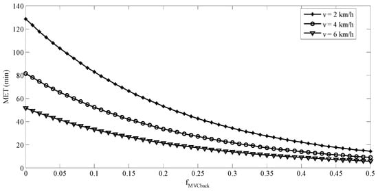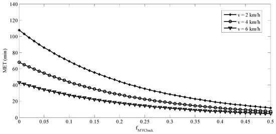 It is well known that fMVC has nonlinear effects on MET and both power and exponential functions have been adopted in the modeling of MET [36,37,46,47]. The early literature [31,32] indicated an indefinite exertion period for low fMVC. The so-called “indefinite exertion period” has been challenged for fMVC as low as 0.05 [48]. A power model of the fMVC was not considered in the current study, because it is undefined when the fMVC is equal to 0. An undefined MET function implies an indefinite MET. This is not reasonable in our backpacking tasks even there was no external load on the back. Exponential model (Equation (2)) was then fitted. In Equation (8), predictive MET was established considering fMVC_back, BW, ramp angle, and walking speed. The fMVC_back, ramp angle, and walking speed were associated with physical burdens or job demand of the tasks. Figure 8 and Figure 9 show the predicted MET using Equation (8) for ramp angles of 0° and 10°, respectively. The predicted MET values in these two figures were calculated using the average BW (63 kg) of the participants. For both ramp angles, the difference between the predicted MET values for any two walking speeds tested was becoming smaller when the fMVC_back was getting higher. The effects of walking speed on the MET were more prominent at low fMVC_back than were at a high one. This was consistent with the findings in the literature [35]. The MET model established in the current study may be used to determine the work/rest allowance for backpacking tasks similar to ours.