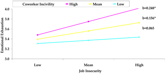 The moderating effect of coworker incivility on the job insecurity–emotional exhaustion relationship; Note: * p < 0.05.