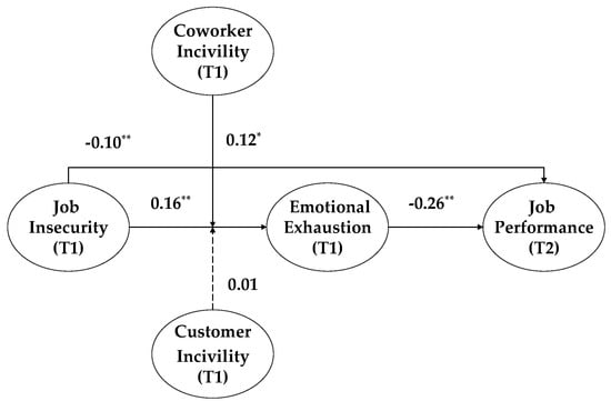 Table 1 presents the means, standard deviations, Cronbach’s alpha coefficients, and correlations of the study variables. The Cronbach’s alphas for the scales ranged from 0.81 to 0.93, which demonstrates a high level of reliability [64]. To evaluate the convergent and discriminant validity, we performed a confirmatory factor analysis (CFA) with the M-plus 8.2 program. The proposed eight factor model (i.e., job insecurity, coworker incivility, customer incivility, emotional exhaustion, job performance, social desirability bias, PA, and NA) exhibited a good fit in an absolute sense (χ2(566) = 998.60; p < 0.05; CFI (comparative fit index) = 0.92; TLI (Tucker Lewis index) = 0.92; RMSEA (root mean square error of approximation) = 0.05; and SRMR (standardized root mean square residual) = 0.05). Furthermore, the eight constructs displayed a sufficient level of composite reliability, ranging from 0.81 to 0.93 (see Table 1). Additionally, we assessed the discriminant validity among the constructs based on Fornell and Larcker’s procedure [65]. Table 1 shows that all AVEs (average variance extracted) were larger than the squared correlation between the target construct and any of the other constructs.