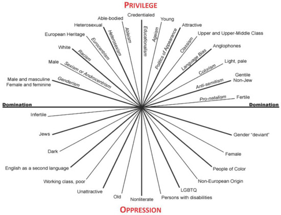 Intersectional analysis is often viewed as a framework for deconstructing power relations within society, however, the derivation of the framework arose in opposition to theoretical mainstream conceptualizations of identity [33,34]. Following the struggles of the Civil Rights and Women’s Rights Movements, feminist scholars argued that race, gender, and class were interconnected as “intersecting oppressions” [35] and that race and gender “are not separate and additive, but interactive and multiplicative in their effects” [36]. Figure 1 illustrates the intersecting axes of privilege, domination and oppression [37].