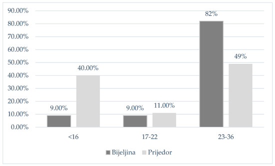 The distribution of respondents according to their level of health literacy is presented in Figure 1. In the total sample, 24.6% of respondents had inadequate, 10% had marginal, and 65.4% had adequate health literacy. Respondents from Bijeljina had lower levels of health literacy compared to their counterparts in Prijedor (p < 0.001).
