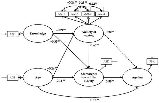 To be able to verify invariance for gender, the model was tested separately for men and for women. The indices of fit of the tested model, for men only, were not satisfactory [χ2(df) = 26.40(10), p = n.s.; χ2/df = 2.64; CFI = 0.58; NFI = 0.58; RMSEA = 0.07 [0.04, 0.11]; SRMR = 0.13; GFI =1.00; AGFI = 1.00]. In contrast, those for the tested model with women only were satisfactory and even better than the general model: χ2(df) = 15.24(10), p = n.s.; χ2/df = 1.52; CFI = 0.93; NFI = 0.92; RMSEA = 0.030 [0.00, 0.059]; SRMR = 0.059; GFI =1.00; AGFI = 1.00]. For the sample of women, as well as for the general sample, anxiety is negatively predicted by knowledge (H1; β = −0.20) and age (H3; β = −0.17). Stereotypes are predicted negatively by knowledge (H2; β = −0.35) and positively by age (H4; β = 0.23) and anxiety (H6; β = 0.54). Ageism is positively predicted by stereotypes (H7; β = 0.59) and age (H5; β = 0.06). Finally, the indirect effect of anxiety about growing old is also significant on ageism (H8; β = 0.33).