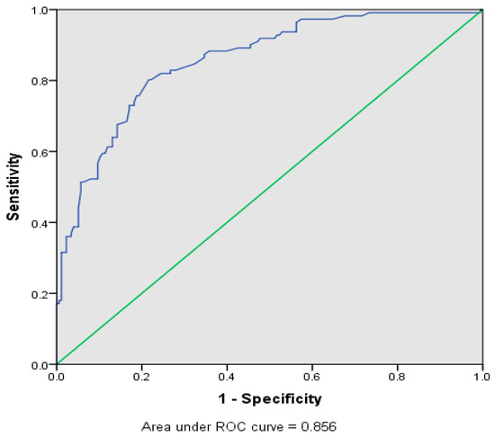 Table 4 shows the final model that was established after the necessary statistical tests. All the variables in the model were statistically significant with a p-value less than 0.05. The variables were ordered preferential to the best selection procedure and the preliminary main effect model processed using the enter method. The model accounted for the matching by factors best on the statistically significant variables. The significant variables that were retained in the multivariable logistic regression for determining the associated factors influencing the erythema inducement included PPE (p = 0.011), PEL (p = 0.004), TOE (p = 0.001), ALT (p = 0.001), and LVS (p = 0.002). In addition, the model stability and the diagnostic ability of the binary classifier shown in Figure 2 were found to be 85.6%, which demonstrates a good fit of the model.