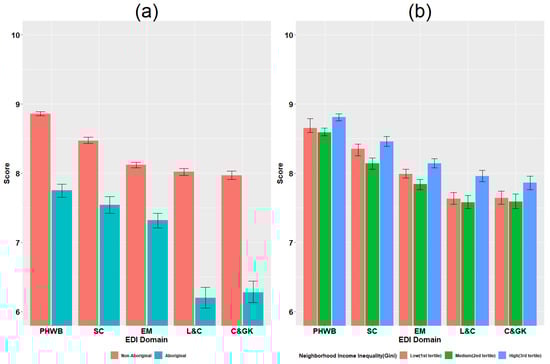 EDI scores by Aboriginal/non-Aboriginal status and neighborhood income inequality. (a) compares mean EDI scores and 95% confidence intervals by EDI domain for Aboriginal versus non-Aboriginal children. (b) compares mean EDI scores and 95% confidence intervals by EDI domain for neighborhoods of low, medium and high income inequality. Abbreviations: PHWB: physical health and well-being; SC: social competence; EM: emotional maturity; L&C: language and cognitive development; C & GK: communication and general knowledge.