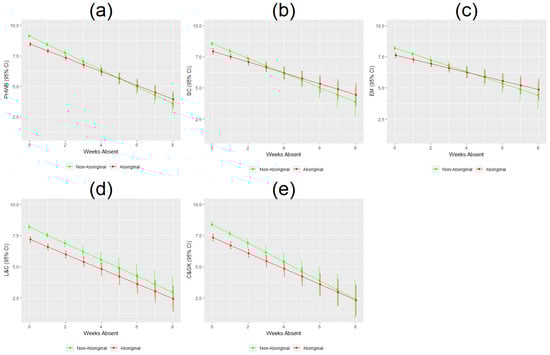 Predicted EDI scores by duration of school absence and Aboriginal/non-Aboriginal status. (a–e) show the relationship between duration of school absence in weeks and predicted EDI domain scores and 95% confidence intervals are different for Aboriginal versus non-Aboriginal children. PHWB: physical health and well-being; SC: social competence; EM: emotional maturity; L & C: language and cognitive development; C & GK: communication and general knowledge.