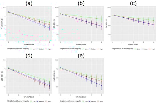 Predicted EDI scores by duration of school absence and neighborhood income inequality. (a–e) show the relationship between duration of school absence in weeks and predicted EDI domain scores and 95% confidence intervals are different for neighborhoods of low, medium and high income inequality. PHWB: physical health and well-being; SC: social competence; EM: emotional maturity; L & C: language and cognitive development; C & GK: communication and general knowledge.