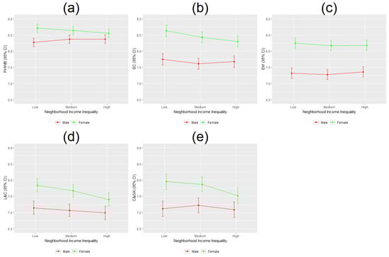 However, compared to girls residing in low income inequality neighborhoods, girls from high income inequality neighborhoods had significantly lower EDI scores (0.116 units lower in physical health and well-being; 0.211 units lower in social competence; 0.356 units lower in language and cognitive development; and 0.418 units lower in communication and general knowledge) (Figure 4a,b,d,e). Neighborhood income inequality appeared to be more detrimental to girl’s development than to boy’s, as girl’s EDI scores decreased to a greater extent as income inequality increased, narrowing the sex-specific gap in EDI scores.