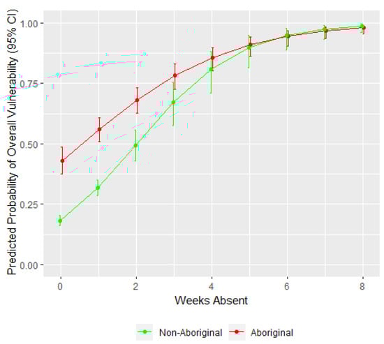 Table 2 presents the results of the logistic regression model showing the association between school absenteeism and the probability of a child being vulnerable (as defined in Section 2.1) as well as the factors that significantly moderate this association. Figure 5 shows the association between duration of school absence and the predicted probability of a child being vulnerable, moderated by Aboriginal status.