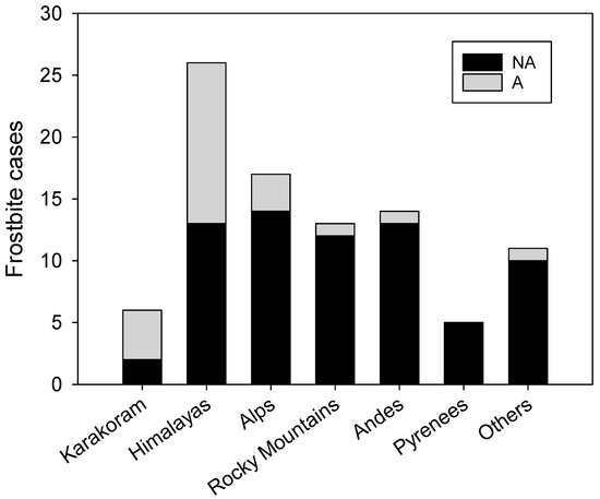 The time lapse between injury and first attention showed significant differences (23.5 ± 27.3 h for NA vs. 42.1 ± 31.6 h for A group; p = 0.003) as well as the mountain range in which the frostbite occurred (Figure 1), with the Himalayas and Karakoram showing the greatest incidences (p < 0.001). Only one case (Mt. Cook, New Zealand) of frostbite resulting in amputation was recorded outside of the Earth’s highest ranges.
