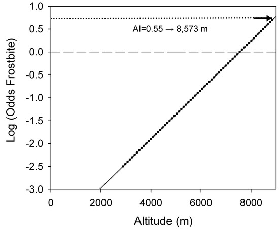The results of this index can be interpreted as the 0 value representing a 50% probability of amputation if frostbite occurs, which corresponds to an altitude of 7547 m. As has been shown, the maximal value of our sample corresponds to an AI of 0.55, which corresponds to a 100% probability of amputation if severe frostbite occurs at altitudes over 8573 m (Figure 3).