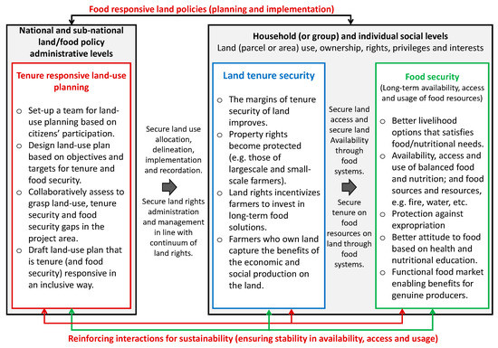 Land-use planning, especially in rural areas, usually involve the participation of farmers who own land or the involvement of farmlands owned by people eager to improve their food security situation. In such a situation, the operational framework ensures that such farmers or land users can capture the benefits of expected socioeconomic production on the land to improve their food security. However, this demands a land-use planning process that allows securing tenure and property rights. It calls for a process that allows for, at least three vital systematic aspects: a tenure responsive land-use planning, a land tenure security, and a food security component (Figure 2). The tenure responsive land-use planning component is embedded in policymaking. There are effects in both land tenure security and in food security.