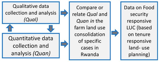 This study follows a mixed methods approach (Qualitative and Quantitative) and a pragmatic world view which fits for a better understanding of complex problematical situations and the consequences of actions. Food security is a very complicated variable which cannot be easily identified by one predetermined method, while the evaluation of consequences of LUC as an action to overcome it similarly needs a multidimensional approach. Creswell [75,76] note that this kind of approach gives the chance to rely on different methodologies and convergent data collection and analysis techniques which gives a better understanding of the problem and enables better solutions. This dictated the use of both qualitative and quantitative methods based on data collected simultaneously from April 2017 to June 2017 as shown in Figure 3.