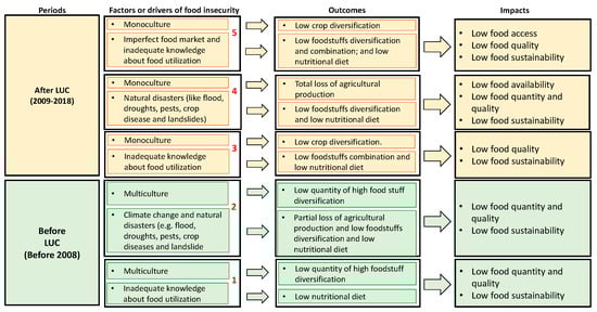 - After LUC 4: In this situation, LUC’s dependence on monoculture, combined with the effects of climate change (change in rainfall patterns and weather conditions) and natural disasters, (floods, pest attacks and droughts) led to low food availability, low food quality, low food quantity and low food sustainability (which are indicators of food insecurity) through the total loss of agriculture production of priority crop in case of natural hazards occurrence. In this case, LUC acts as a bridge of climate change towards food insecurity.