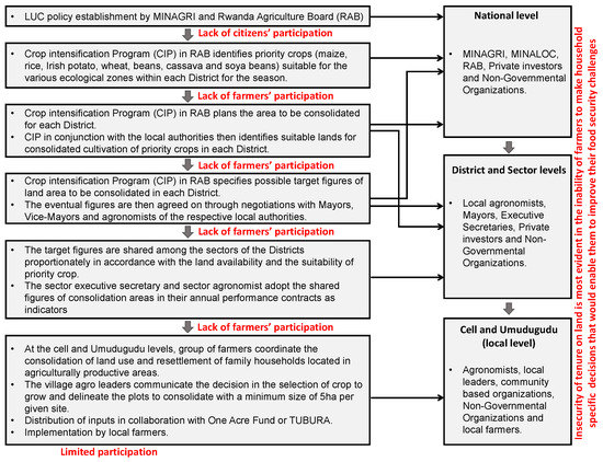 From the process of LUC represented in Figure 5, it can be seen that local people only implement the instructions of local authorities in a top-down way. The evidence from local authorities reported the problem of performance contracts and targeted figures to meet, as one of the factors inducing them to force local people to grow the government approved priority crops chosen for them at national and district level based on different agro-ecological zones in order to protect their jobs. A significant feature of the process of the LUC is that it lacks citizens’ participation in its core areas for instance, in its establishment, crop intensification decisions, crop types to be used, land sizes to be cultivated, land areas to be used and specific activities to be indulged. Despite that land tenure has been regularized in Rwanda, land rights (related to decisions on the what-and-how aspects of land uses) that would enable them to solve their household specific food security challenges are either unprotected or infringed upon by the LUC process. This is evidence that the farmers involved in the LUC are not secure enough in ways that would secure food for their families. Hence, any efforts towards improving food security must include the widening of the margins of tenure security on land.