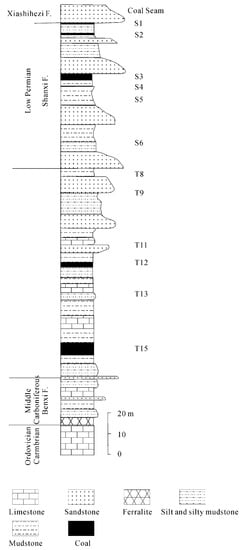 The Yangquan coal mining district is located south-west of Yangquan city (Shanxi province, E 113°36′ N 37°53′). Until the end of 2004, the total known reserve of coal at Yangquan had been estimated to be 104 Gt, covering an area of 1051 km2. The major periods of coal formation are Carboniferous (Taiyuan Formation) and Early Permian (Shanxi Formation) (Figure 1) []. The coal-bearing strata are made up of nineteen coal seams, with a total average depth of 175 m. The coal-bearing strata overlie Ordovician and Cambrian marine limestone and are overlain by the Xiashihezi Formation (Early Permian), the Shangshihezi Formation (Later Permian), and Triassic clastic units. The lithology of the Taiyuan Formation is mainly consisted of quartz sandstone, siltite, silty mudstone, mudstone, limestone, and coal. The lithology of the Shanxi Formation is mainly composed by feldspar-quartz sandstone, siltite, silty mudstone, mudstone, and coal.