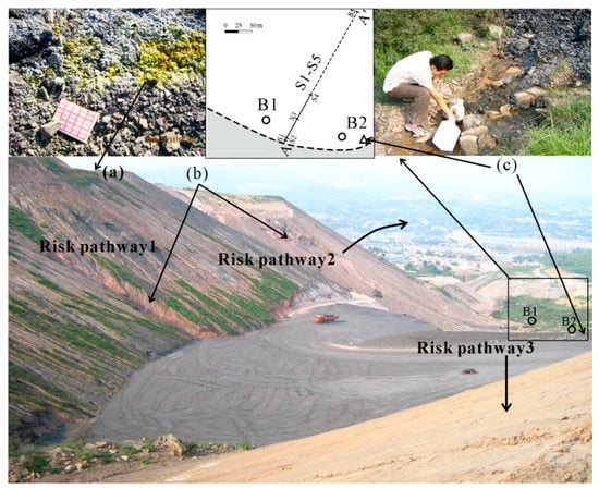 The largest coal spoil pile in Yangquan coal mine, No. 2 Coal Mine. (a) CSFGM, coal spoils fire gas minerals; (b) fired coal spoils; (c) leachate discharge from the coal spoil piles; S1–S5, soil samples collected in the front of the coal spoil bank with a distance of 5, 10, 50, 100, and 500 m (profile A–A’); B1 and B2, bore holes; bold dash line, the front boundary of the coal spoil bank. Also shown in the figure are the three risk pathways for polycyclic aromatic hydrocarbons (PAHs): Pathway 1, spontaneous combustion, and precipitation leaching of coal spoil piles; pathway 2, transportation of coal particles from the piles; pathway 3, infiltration of coal spoils into the soils.