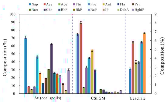 Distribution patterns of PAHs in coal spoils, CSFGM, and Leachate (Av.(coal spoils) is the average value of PAHs of the four coal spoil samples; Nap composition is shown in the left Y-axis, other PAHs composition is shown in the right Y-axis).